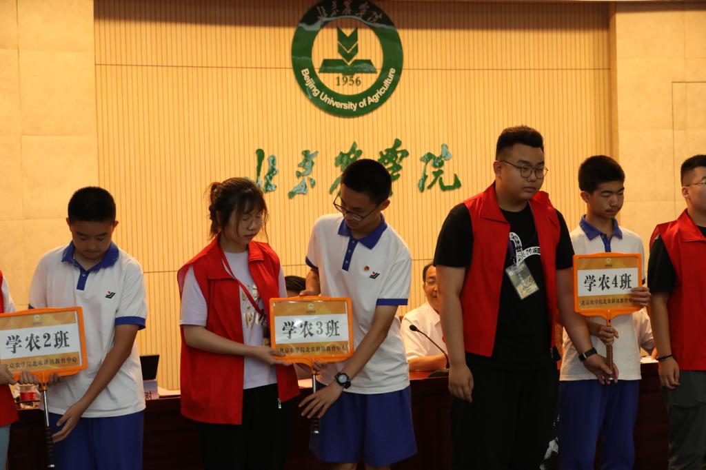 北农耕读教育中心主要负责人陈学珍教授为学农公司授旗,各班志愿者为学农班授牌。