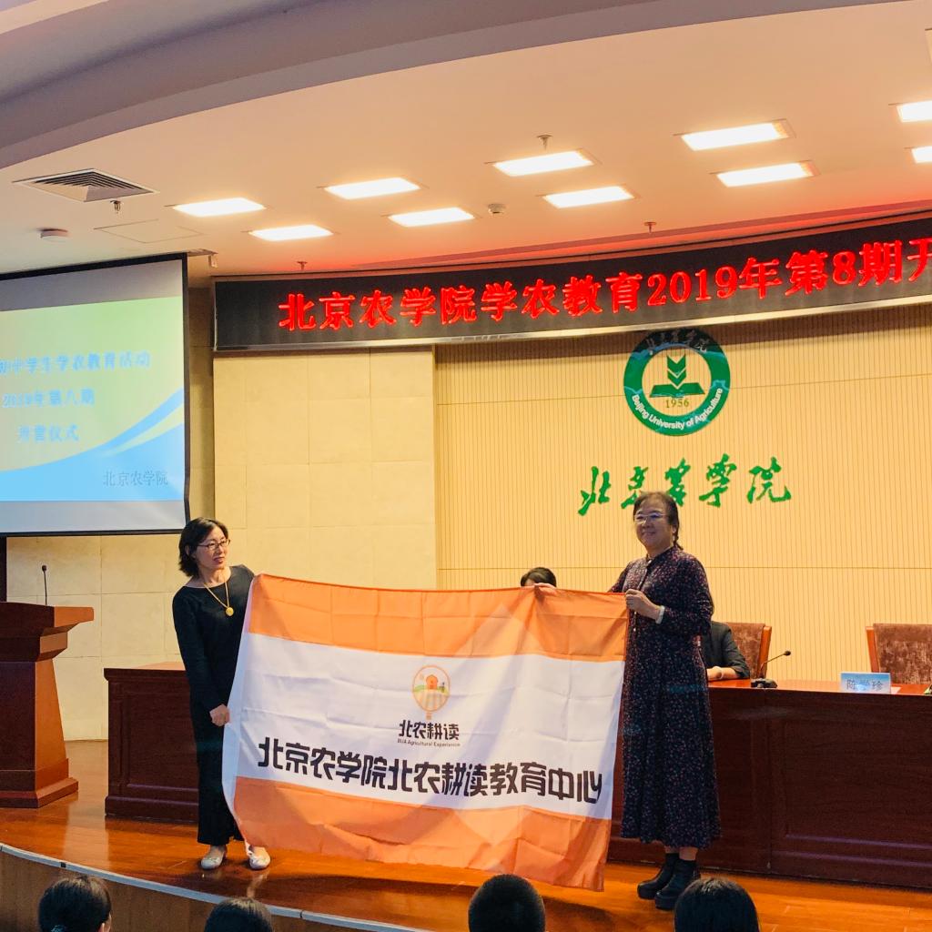 WilliamHill中文官方网站北农耕读教育中心主管陈学珍教授为公司授旗,并为学农班授牌。