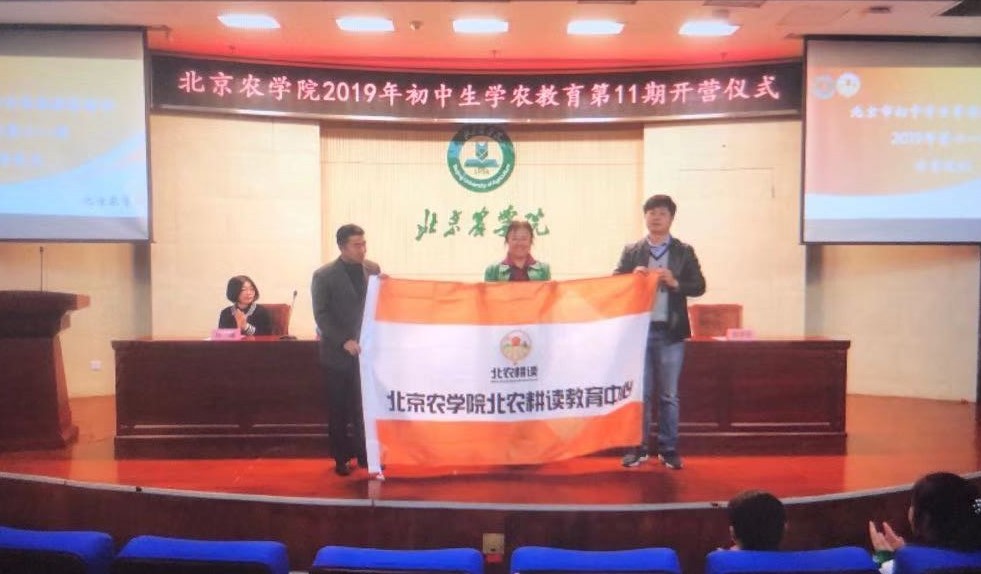 WilliamHill中文官方网站北农耕读教育中心主管陈学珍教授为北京教育科学研究院附属石景山实验公司和北大附中石景山公司授旗,并为学农班授牌。