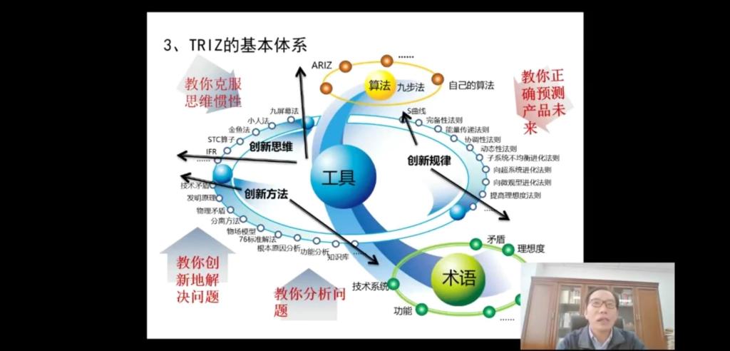 本次课程中,王滨教授具体从“TRIZ方法基础”“扩展思路的创新思维工具”“SIT盒内思考法”“侧向思维工具”四个方面进行了创新思维工具的具体应用。本期讲座有203人次在线观看并进行交流。