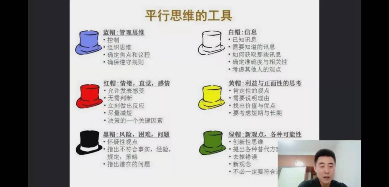 本次课程中,关小旭老师从认识六顶思考帽、世界咖啡馆以及使用说明和注意事项;案列分析、练习进行了讲述,直播课共有218人观看。