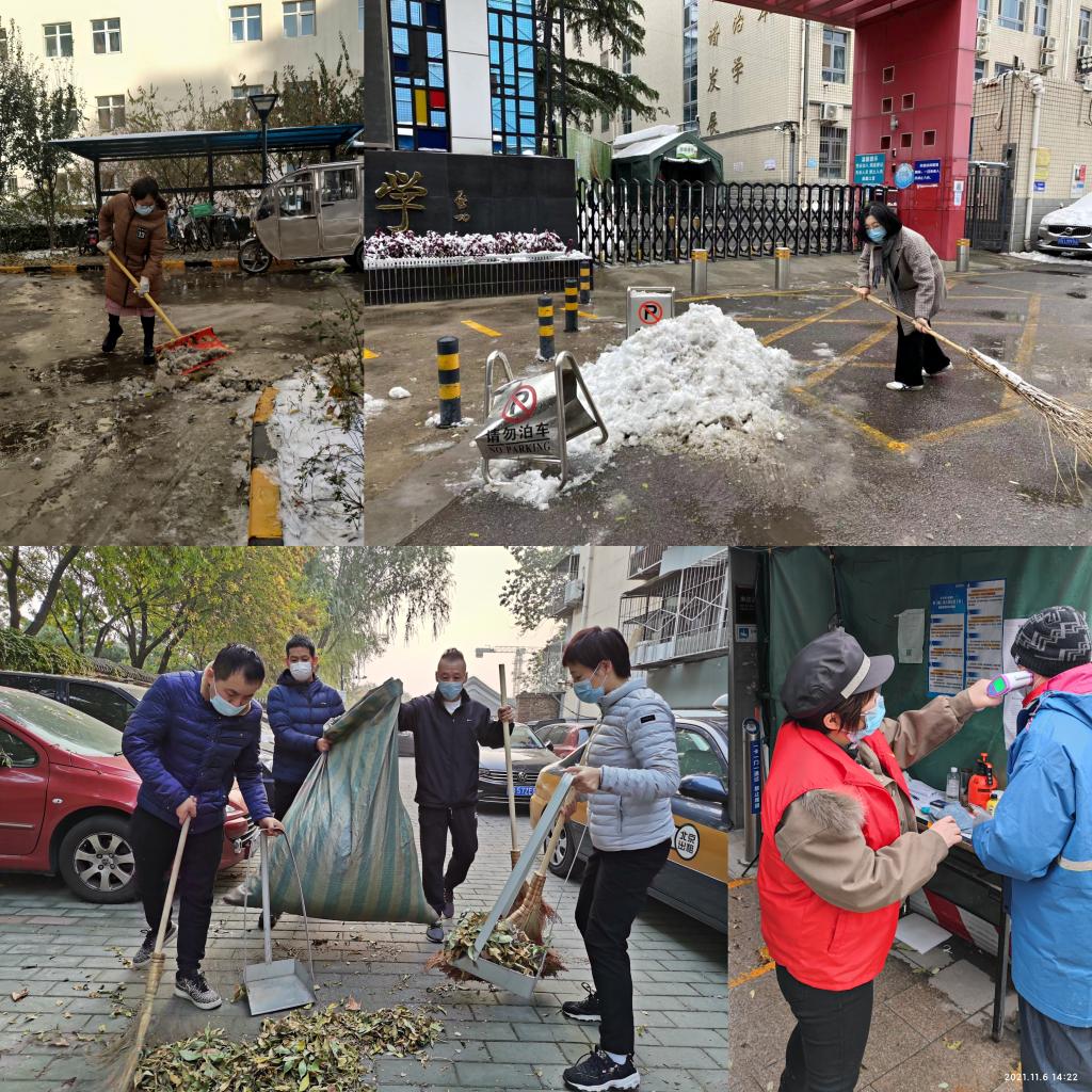 活动中,同志们纷纷行动起来,有的为小区门口清扫积雪,扫除道路浮冰,保障小区人们出行安全;有的为小区主要道路清扫落叶;有的配合社区疫情防控工作,对进出人们进行扫码测温。大家在体会劳动的快乐,奉献着自己的光和热,守护着美好的家园。