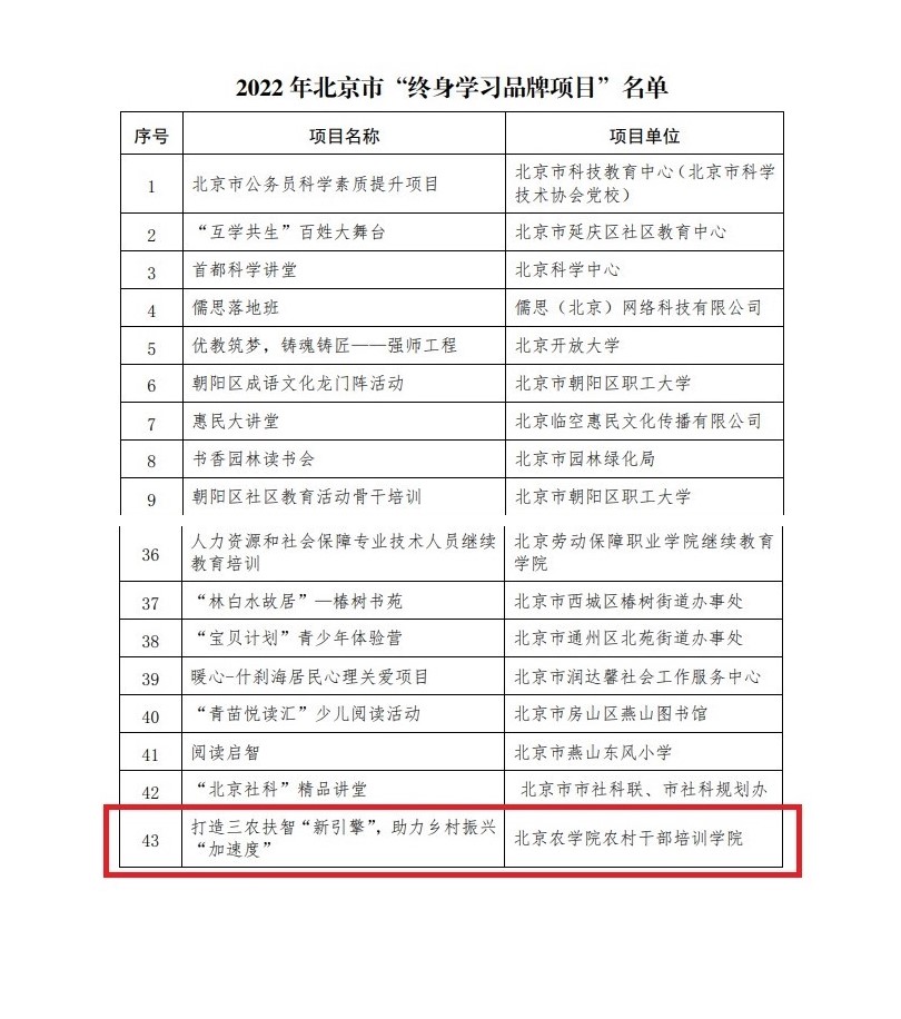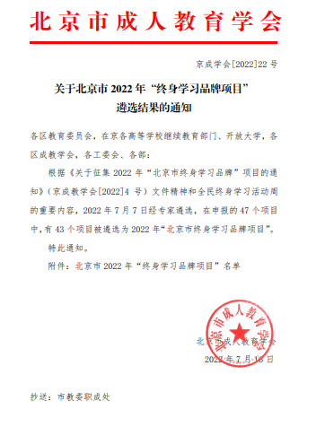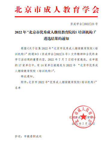 根据北京市成人教育学会《关于征集2022年“北京市优秀成人继续教育院校(培训机构)”的通知》(京成教学会[2022]5号)和《关于征集2022年“北京市终身学习品牌”项目的通知》(京成教学会[2022]4号)两个文件精神,WilliamHill(农村干部培训公司)围绕首都经济社会发展和百姓终身学习需求,结合近五年来办学情况及所开展的灵活多样、特色鲜明的终身学习相关工作,高质量完成申报材料、支撑材料及宣传视频。经专家评审,WilliamHill获批“北京市优秀成人继续教育院校(培训机构)”;由农村干部培训公司申报的“打造三农扶智新引擎,助力乡村振兴加速度”获批“北京市终身学习品牌”。